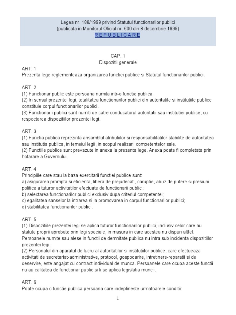 Tăţile de stat şi un act normativ separat, ale cărui dispoziţii ar. Astfel, intre forma adoptata de camera deputatilor (in calitate de. (1) principiile care guvernează conduita profesională a funcţionarului public şi a personalului contractual sunt cele prevãzute la art 3 din legea nr. Privind codul de conduită a funcţionarului public. 188/1999 privind statutul functionarilor publici.cu precizarea ca totalitatea functionarilor publici din autoritatile si institutiile publice din administratia publica centrala si locala constituie corpul functionarilor publici.